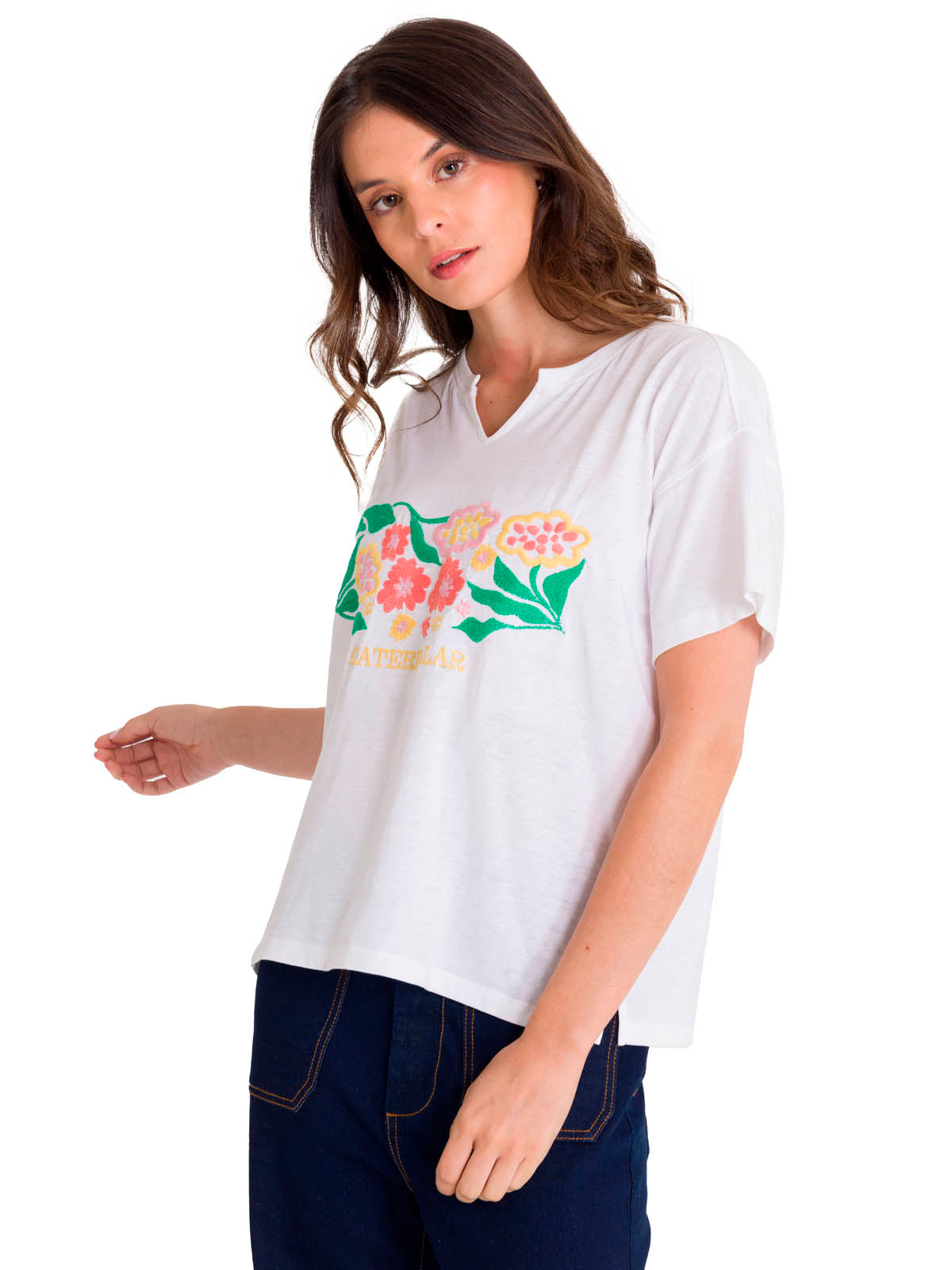 Polera Manga Corta Casual Mujer NOTCH NECK EMBROIDERED FLORAL TEE Blanca Cat