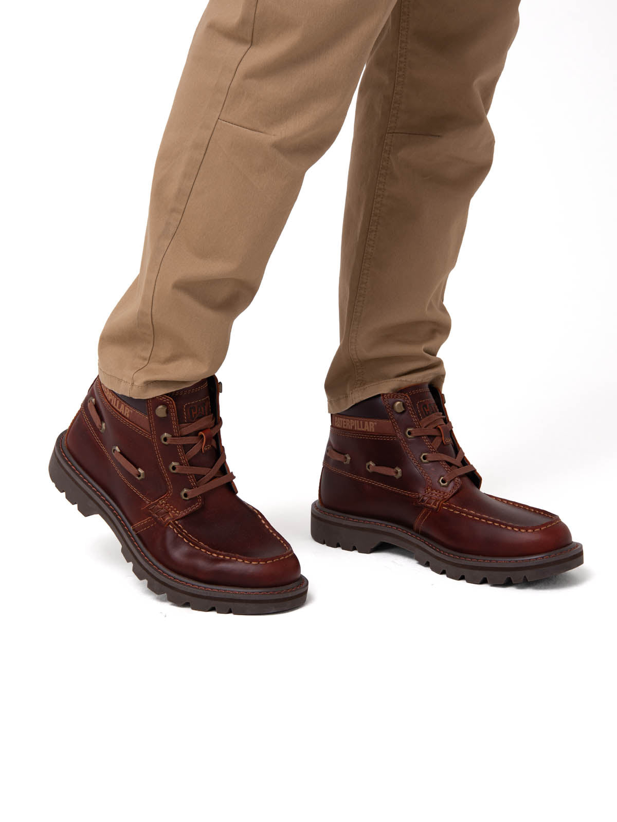 Este modelo CAT combina el carácter tradicional de un moc toe con el espíritu robusto de la marca. Su construcción firme transmite solidez al caminar, mientras que sus detalles de diseño revelan personalidad y autenticidad en cada costura.